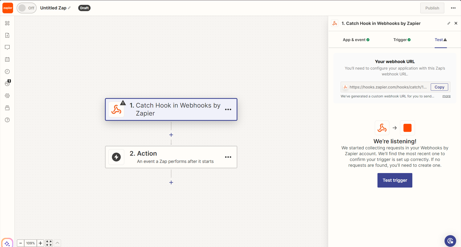 After that, there will be a page where you’ll have to set the following settings: select Webhooks for the Trigger option, and for the Trigger Event Select Catch Hook.